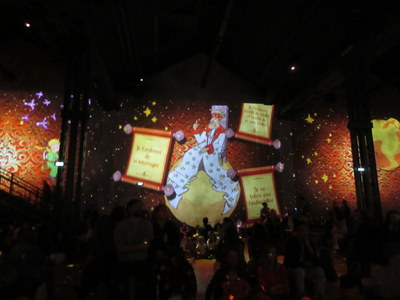 This month, the Atelier des Lumières was alternating Van Gogh with Le Petit Prince. We've seen the former but were delighted to be able to schedule the latter. All the previous shows we've seen there or in its sister venues have been about painters and have been wordless, featuring only carefully chosen background music. Because this one was about a story, I hoped it would incorporate spoken text from the book, and it did. Essential bits were translated into English in a narrow line of supertitles near the ceiling. The accompanying music was popular songs, like I Only Have Eyes for You and Stand By Me. The whole thing was lovely.