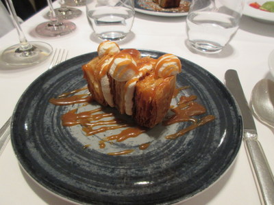 The real dessert was thismagnificent vanilla millefeuille, heavily drizzled with caramel sauce. It looked huge, but it was mostly air; I can't believe I ate the whole thing.