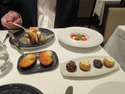 Meanwhile, at the right, David attacks the array of desserts and mignardises. His fork is in the incredibly crisp and light millefeuille; he has yet to tackle the panna cotta. Once those were dealth with, we split one of the two madeleines, and David ate one of the tiny chocolate tarts.