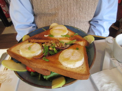 But that was just the beginning. At the left here is the board they brought us, from which I had already chosen the two little wedges. The other three varieties were also excellent. They even brought us each a slice of fruit bread to go with the cheese.